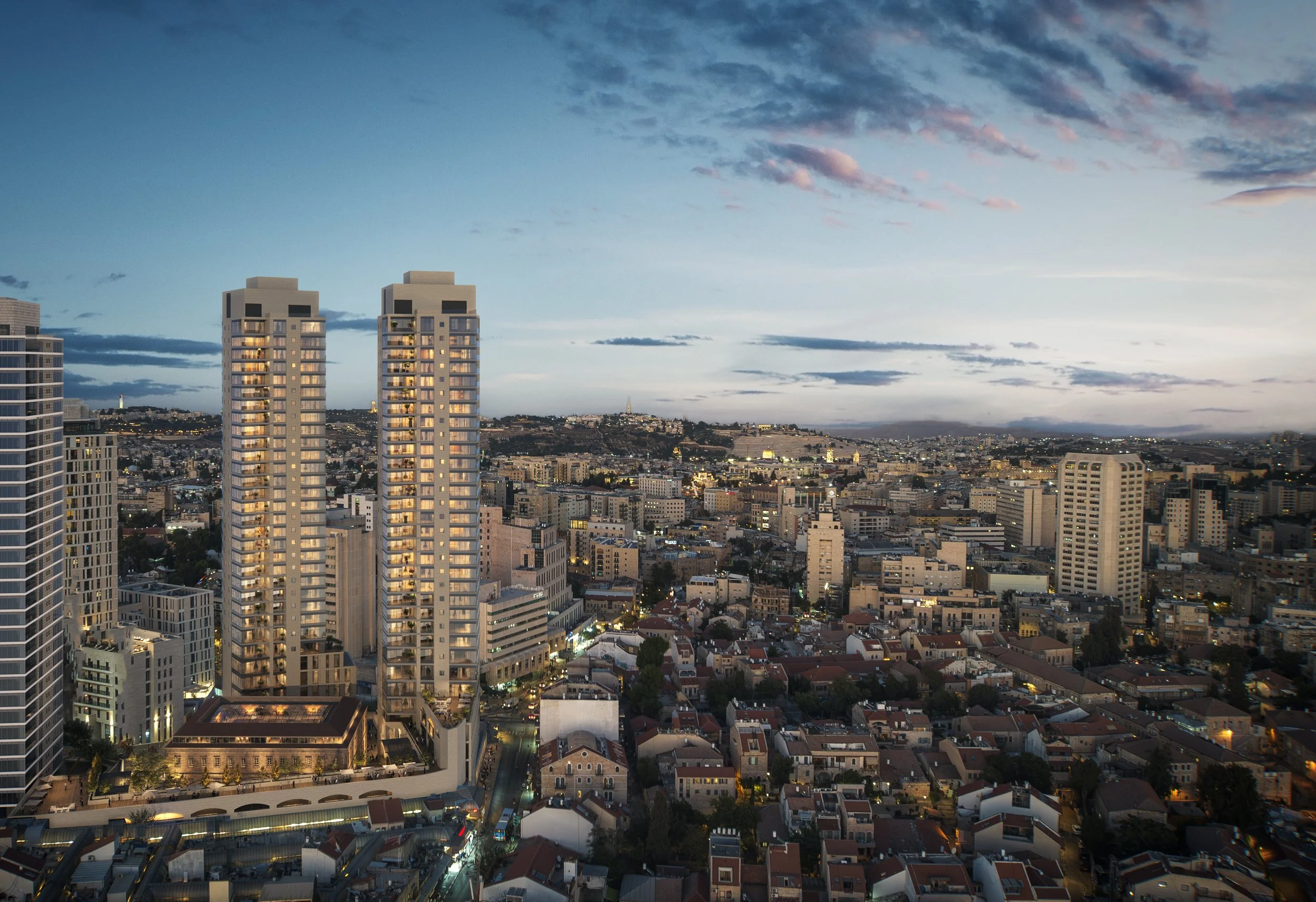 The towers are rooted in Jerusalem, from stone finishes to skyline.