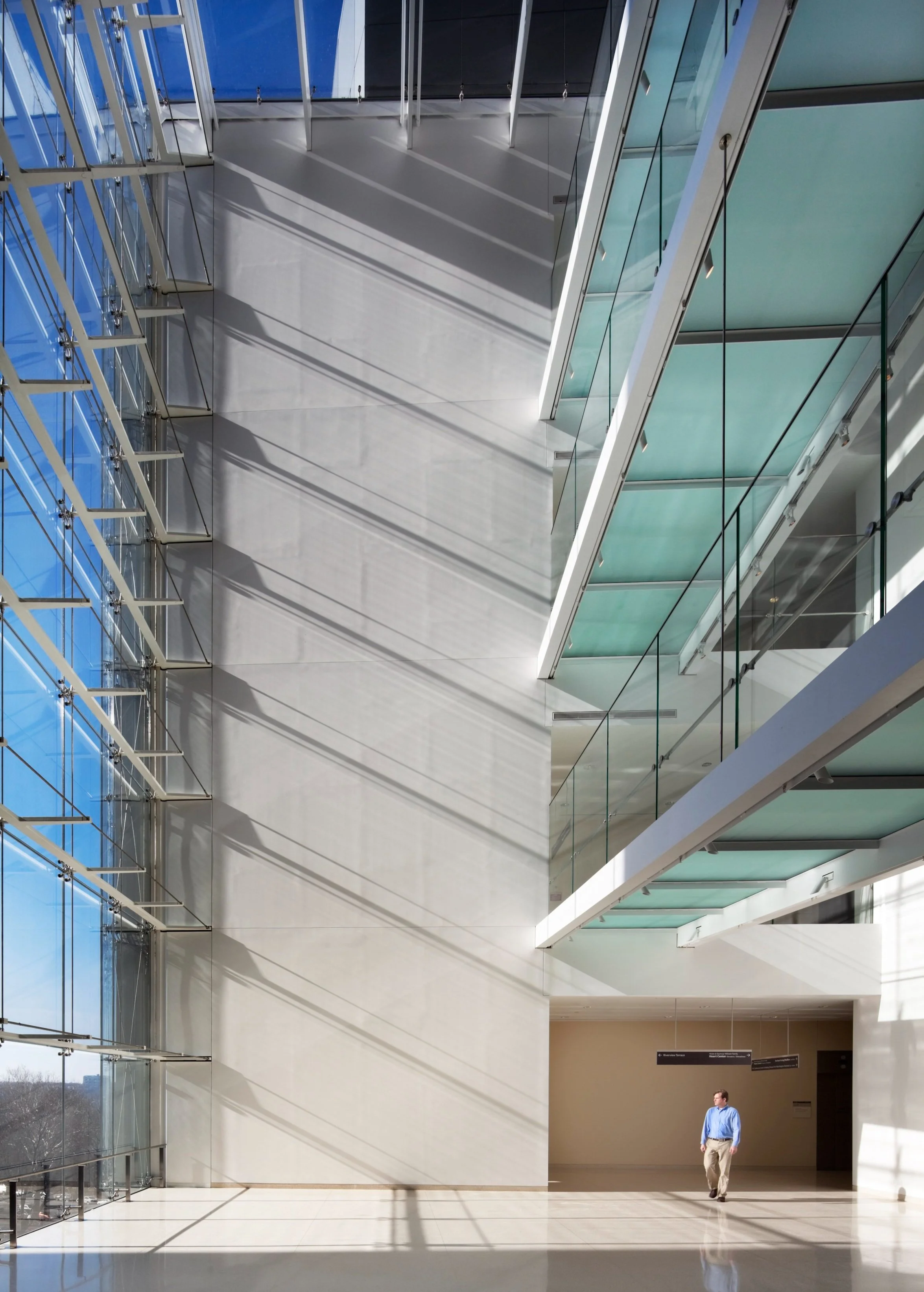 A tightly detailed vertical atrium space provides orientation as well as views of the Hudson River and the New York sky. A system of electronically controlled solar vanes tracks the movement of the sun, and in conjunction with climate wall technology, provides a well-tempered interior environment.