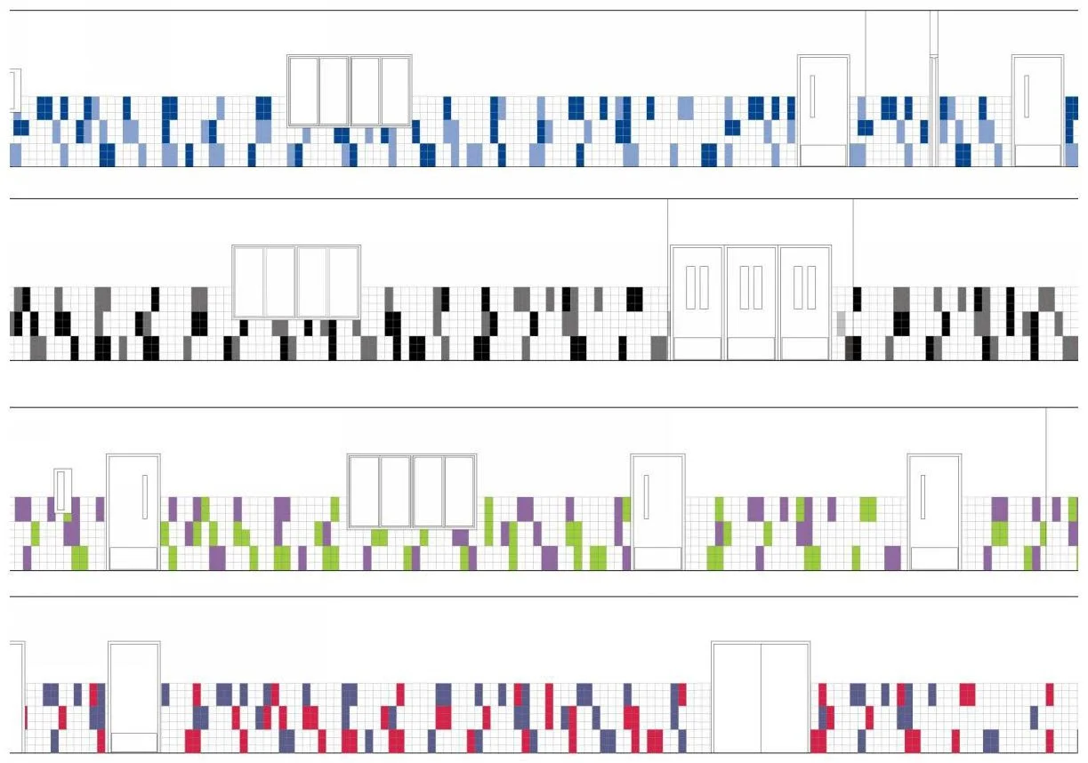 Throughout the school, each wall is distinguished by unique patterns. The playful tiles in the cafeteria are colored in condiment colors.