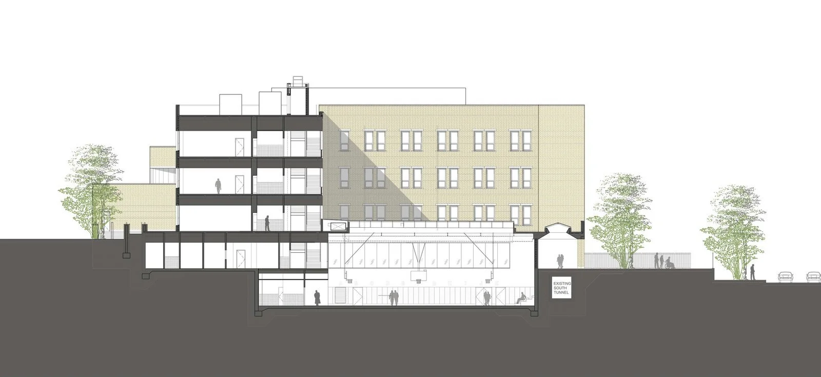 A colonade along the building’s main facade adjusts the building scale from institutional to residential. It allows access to a utilities tunnel beneath, and is illuminated by a brightly colored mural designed by the artist Sarah Morris.