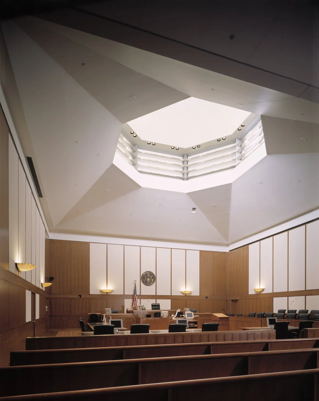 The building’s principal functional components are arranged from the most public to the most secure. Various design strategies introduce natural light into the interior, from the large glass walls at either end of the vaulted public hall to the incised courtyards in the judges’ wing and the light monitors filtering daylight into the courtrooms. The play of light on natural materials imparts a simple yet uplifting luminosity to the building.
