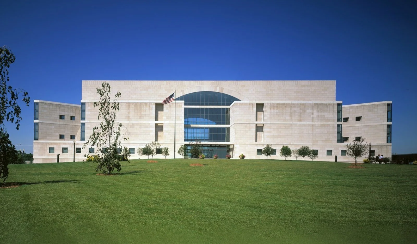Set in its own landscape, the building respects the five-story scale of downtown Hammond. Its horizontal profile, simple geometry, and planar limestone walls are a stable counterpoint for the heterogeneity of the surrounding city fabric.